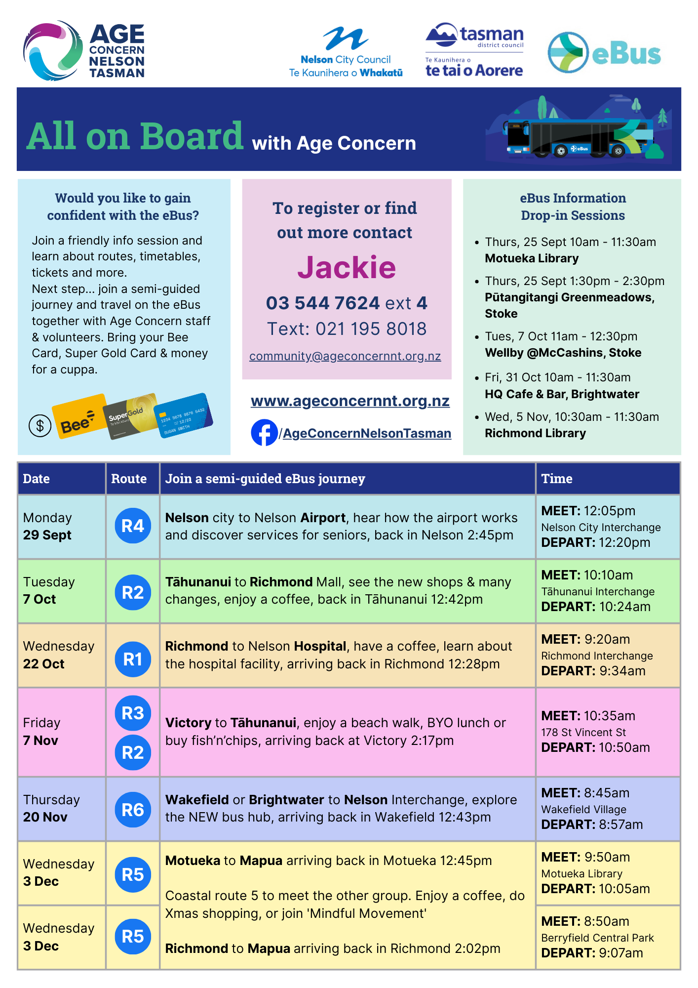 We’re really excited to be continuing our local bus awareness initiative All on Board. Supported by both Nelson City and Tasman District Councils it’s all about supporting and encouraging older adults to use the eBus service.